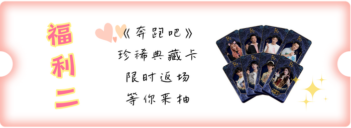 二、福利二,即“奔跑吧典藏卡”属于限量奖励,届时将会抽签发放。欢迎积极转发本页面,后台会统计转发分享次数,并根据真实有效的转发分享次来加成中签几率。